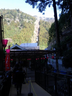 We started out with a trip to the upper temple. Here you can see the little cable car on its way down towards the station. Note the slope of the mountain, it doesn't look too crazy steep from this angle, right?